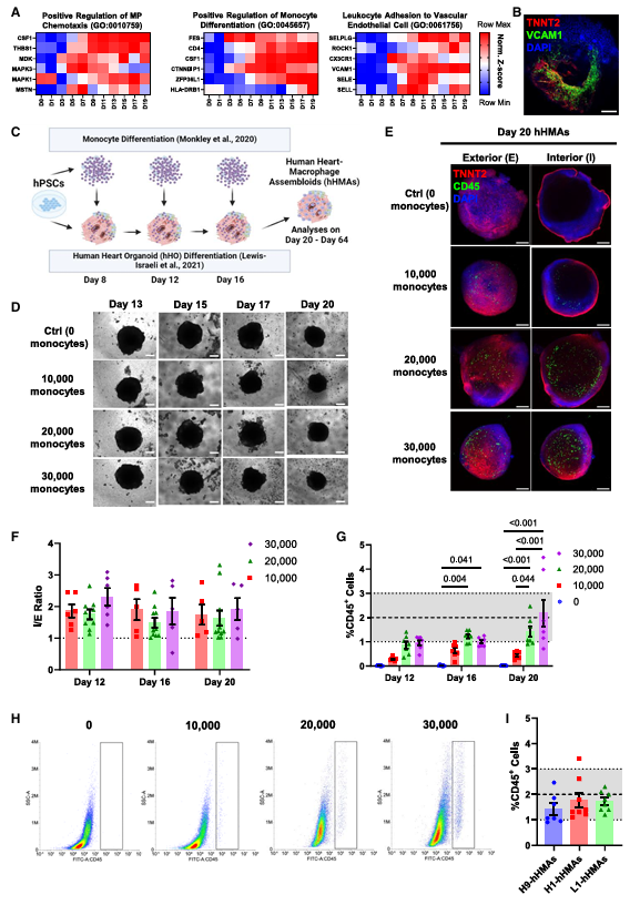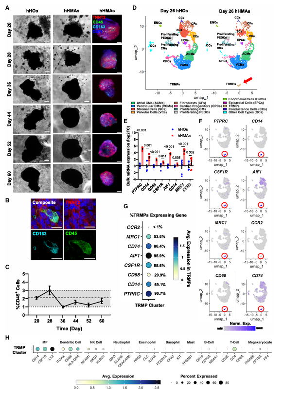 研究团队首先找到一套高效的组装方法:在人心脏类器官分化的关键阶段,加入由自体人多能干细胞培育的卵黄囊样胚胎单核细胞。这些单核细胞能自然融入心脏类器官,还会分化成组织驻留巨噬细胞(TRMPs),并且能长期稳定存在。其在组装体中的比例(1%~3%)和人类胚胎心脏里的生理水平完全一致,这为后续研究打下了贴近生理的基础。