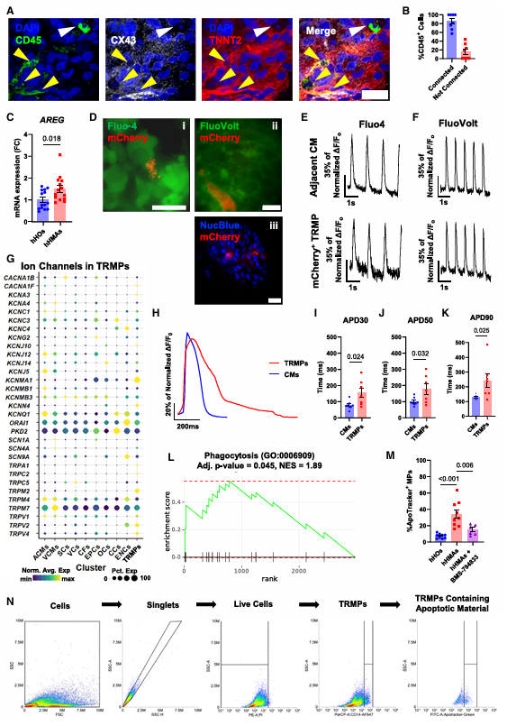 图3 心脏-巨噬细胞组装体包含功能性心脏组织驻留巨噬细胞,可与电系统偶联并执行胞葬作用