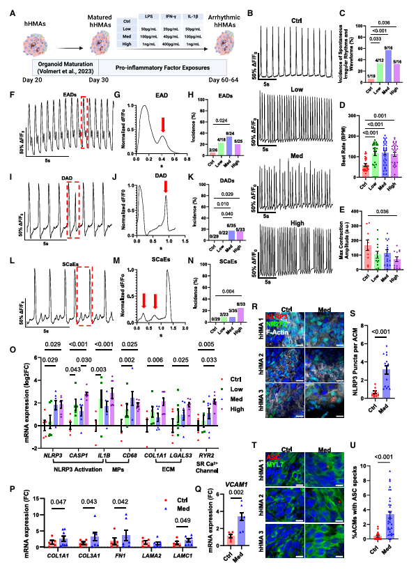 为了验证这个组装体能不能用于疾病研究,团队还做了房颤建模实验。把成熟的hHMA暴露在脂多糖(LPS)、IL-1 等已知会诱发房颤的炎症因子中,结果很明确:慢性炎症会激活NLRP3炎症小体,让TRMPs变成促炎表型;接着,心房肌细胞就出现了早期后除极、延迟后除极等典型的心律失常特征,甚至表现出不规则电活动、心率加快等房颤症状。更关键的是,用NLRP3抑制剂MCC950处理后,这些房颤表型能被有效逆转,这和临床中 NLRP3激活参与房颤发病 的观察结论完全吻合。