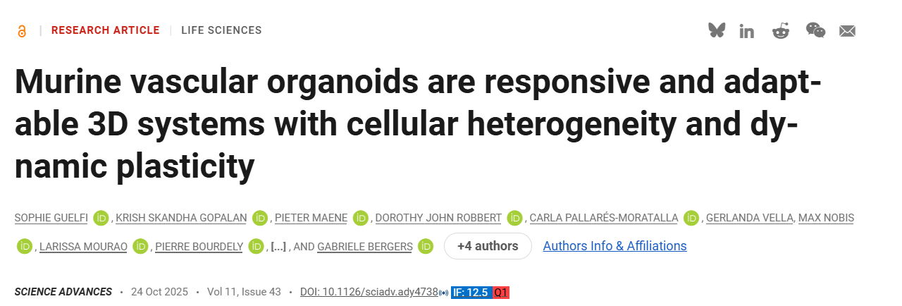 Guelfi S, Gopalan KS, Maene P, et al. Murine vascular organoids are responsive and adaptable 3D systems with cellular heterogeneity and dynamic plasticity.Sci Adv. 2025;11(43):eady4738. doi:10.1126/sciadv.ady4738