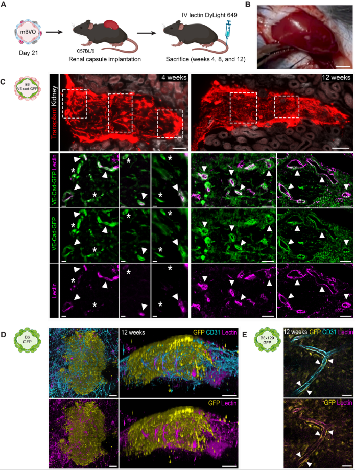图2:小鼠血液血管类器官移植到同基因或异基因小鼠肾包膜