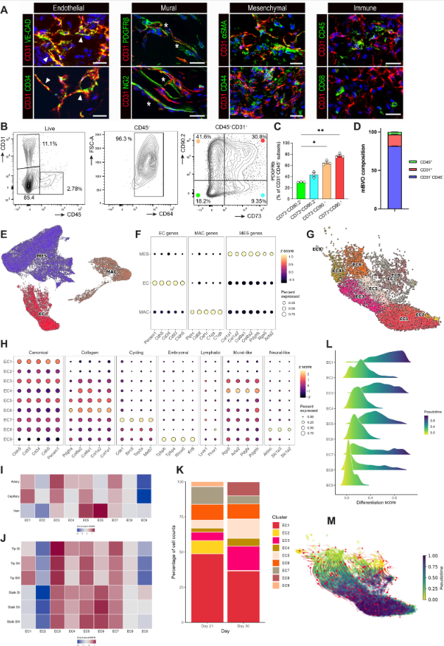 借助流式细胞术、单细胞RNA测序和整体组化等技术,研究人员进一步解析了mBVOs的细胞组成,发现其在生长高峰期(第21天)和完全成熟期(第30天)均展现出明显的细胞异质性,主要包含三大细胞谱系。其中,内皮细胞占总活细胞的约15%,表达CD31、VE-钙粘蛋白等经典内皮标志物;间充质细胞是主要成分,占比约80%,涵盖周细胞、基质细胞及间充质干细胞样细胞;巨噬细胞占比约3%,多为髓系来源且高表达CD64。值得关注的是内皮细胞的高度可塑性:它们不仅能向动脉、静脉、毛细血管及尖端/茎细胞表型转化,在完全成熟阶段还会呈现神经样特性。单细胞转录组分析更发现,内皮细胞可分为9个亚群,且随时间动态转变 胚胎样亚群在成熟期消失,神经样亚群在成熟期出现,多数亚群还会同时表达动脉、静脉或尖端/茎细胞的特征基因。间充质细胞与巨噬细胞也分别存在12个和4个亚群,随mBVOs成熟呈现出差异化的分化潜能与表型变化。