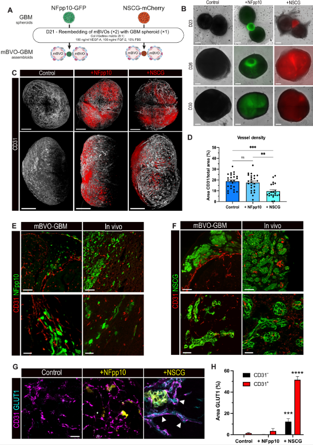 为验证mBVOs在肿瘤研究中的价值,团队将其与两种具有不同侵袭模式的胶质母细胞瘤球(NFpp10和NSCG)组装成类器官联合体。结果显示,在mBVOs中呈现出与体内一致的生长特征:NFpp10细胞以单细胞形式沿血管侵袭,完美复刻其在小鼠脑内沿血管迁移的模式;NSCG细胞则形成簇状结构破坏血管网络,模拟了其在体内的血管共择生长特性。同时,mBVOs的血管内皮会上调醛缩酶C、谷氨酸转运体及葡萄糖转运体GLUT1的表达,展现出对肿瘤微环境的代谢适应。